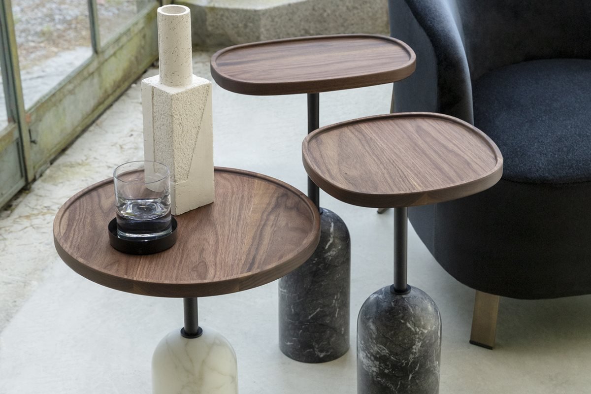 Beautiful side table with solid walnut top with curved edge and marble base in dark grey or white marble, connected with black metal powder coated pedestal.